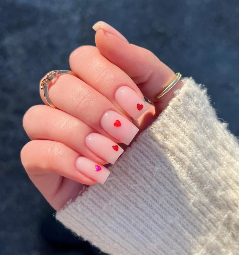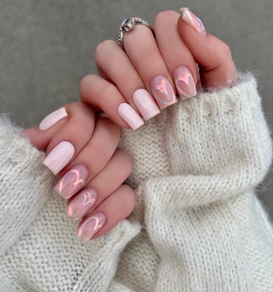 - Soft pink Valentine nails with subtle heart details