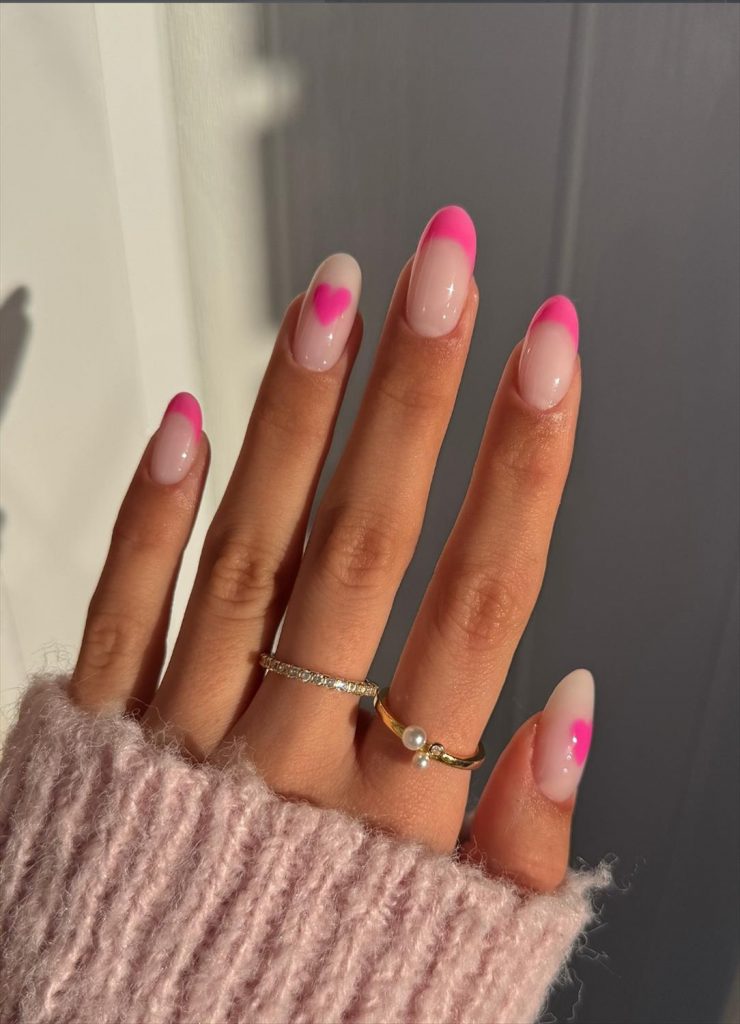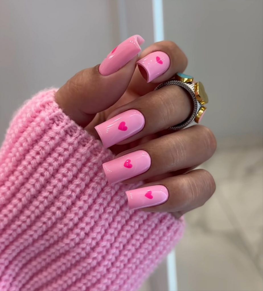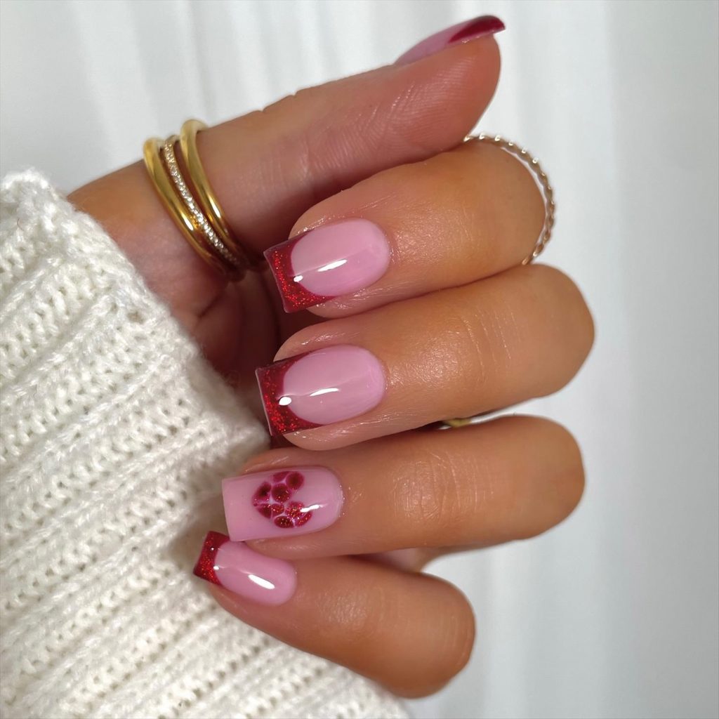 - Pink nails with red heart accents