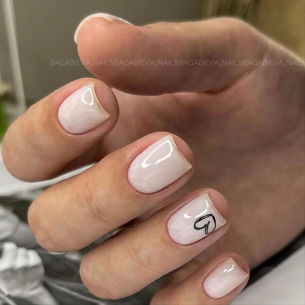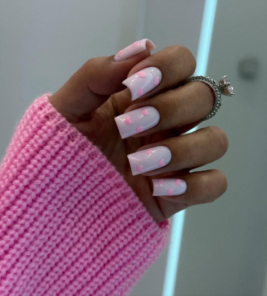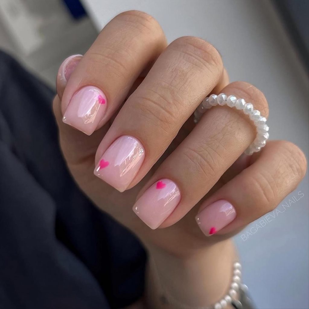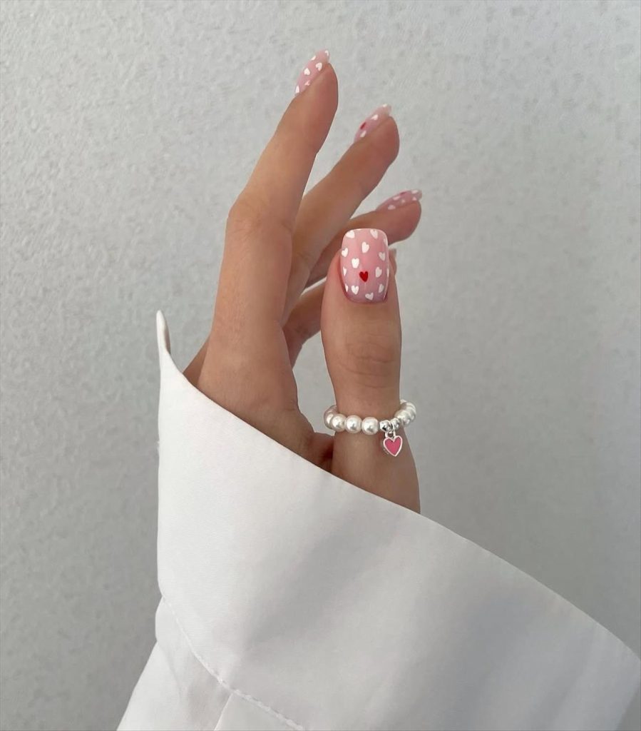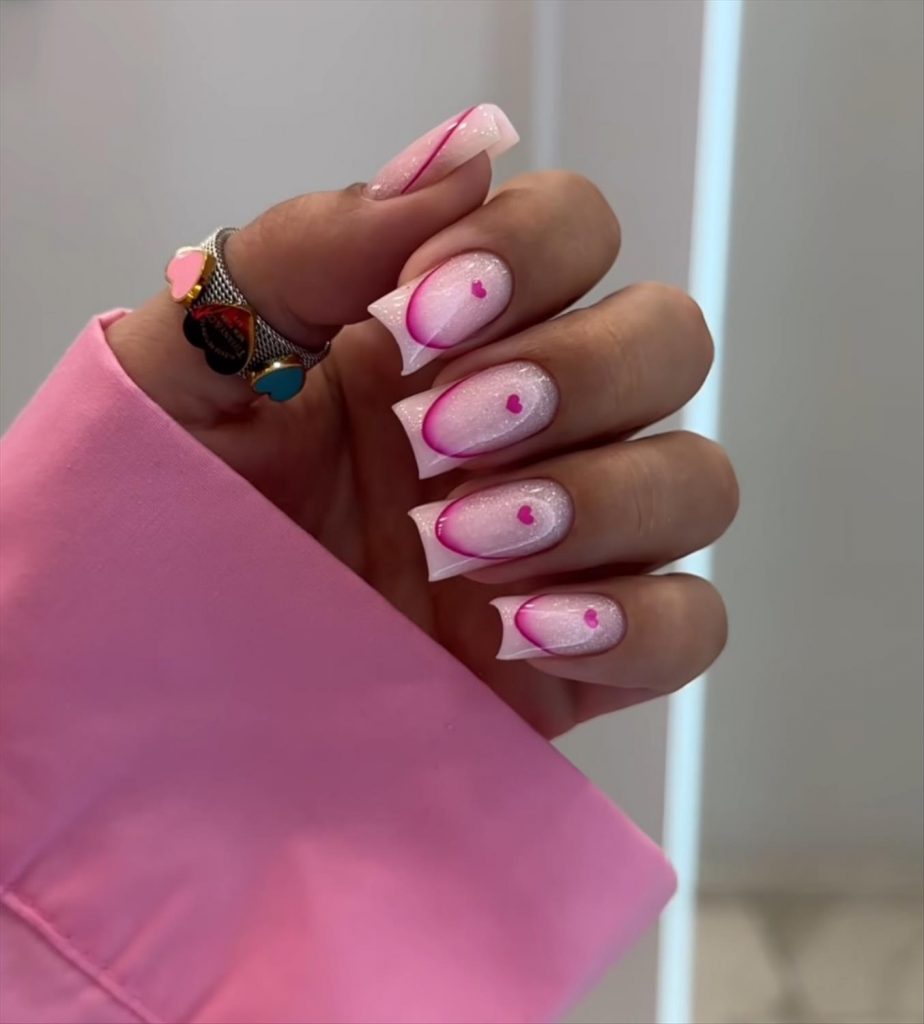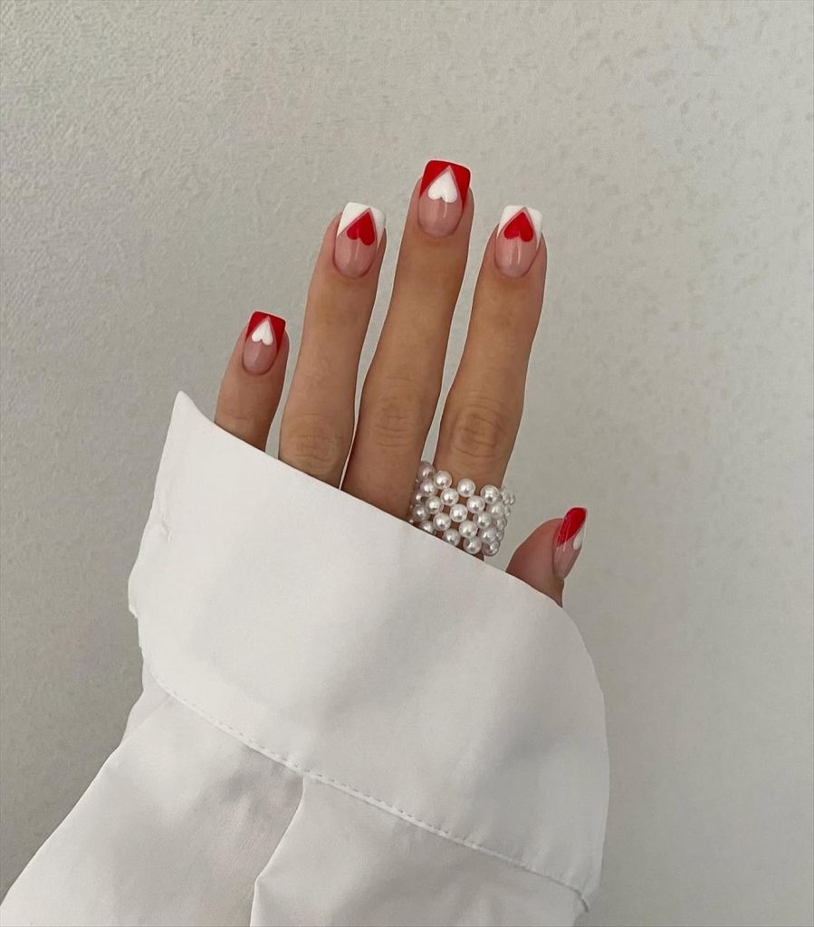 - French tip Valentine nails with hearts