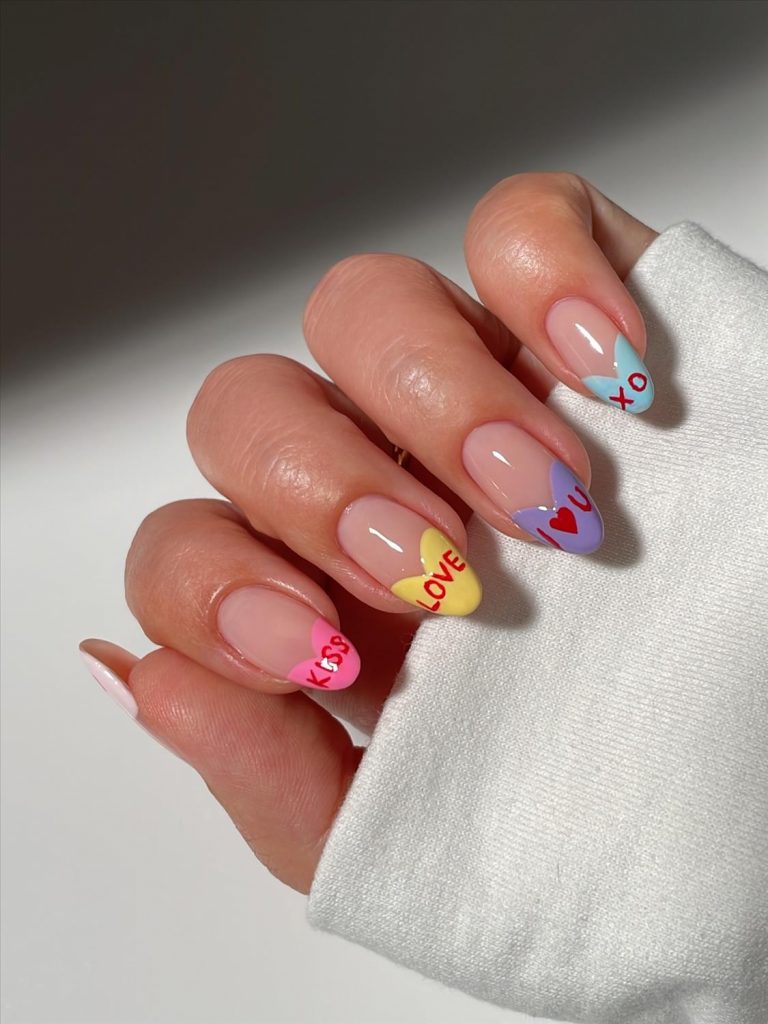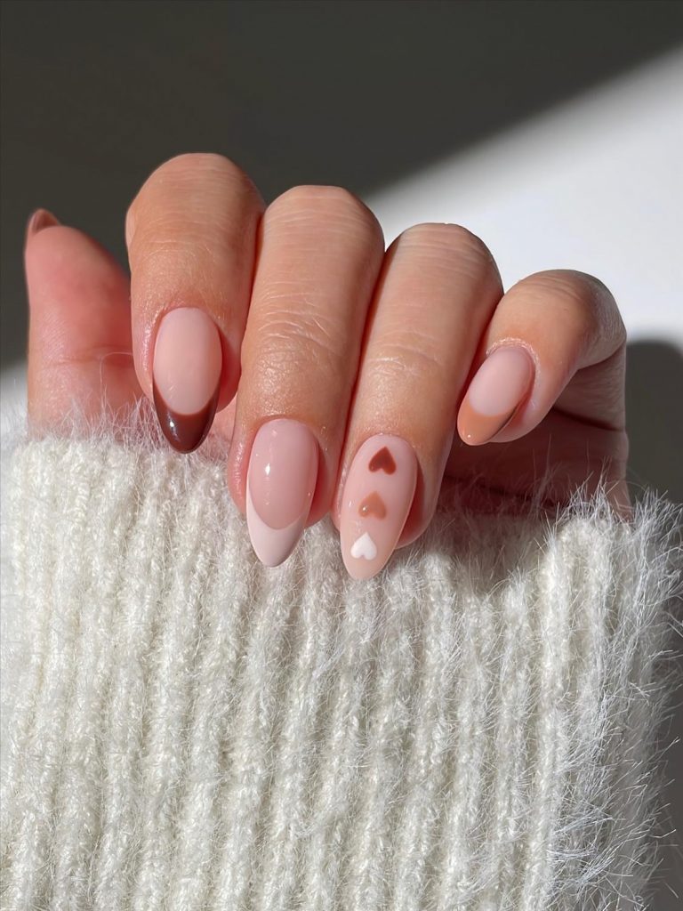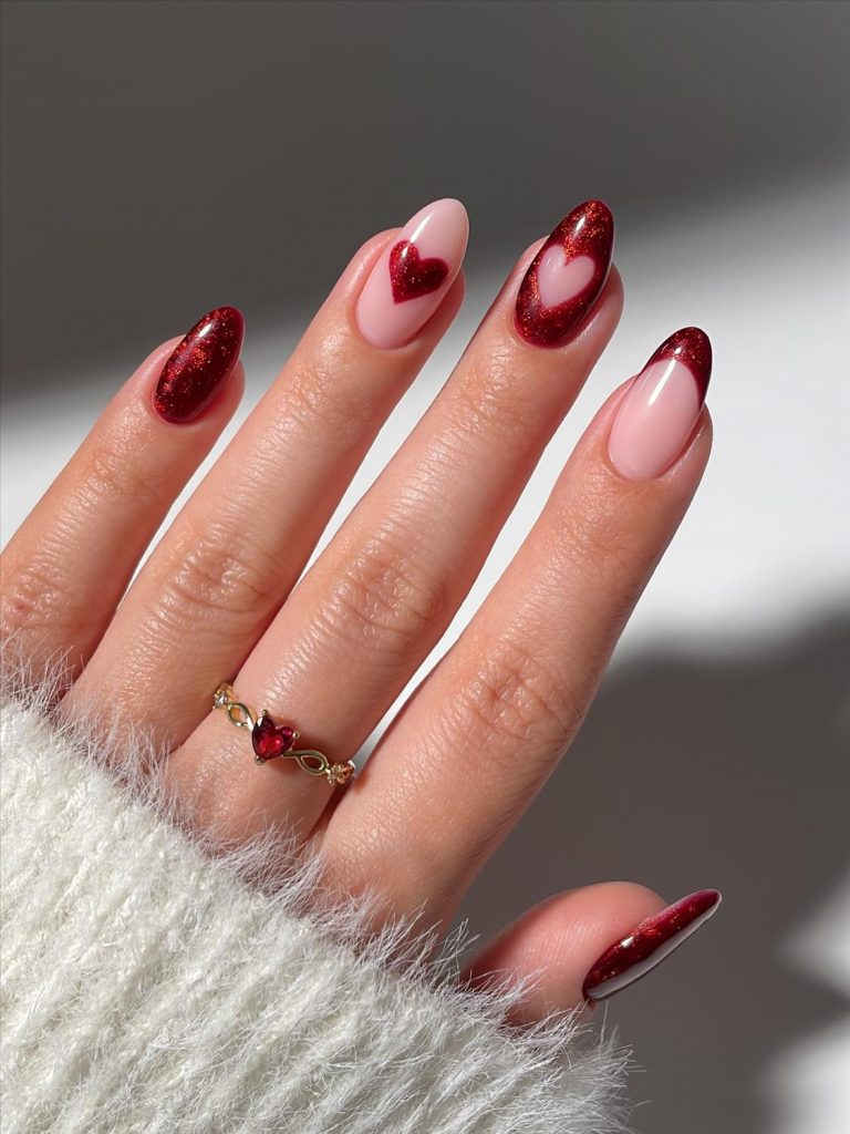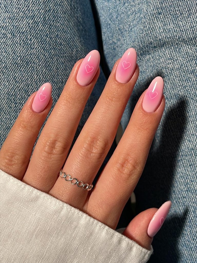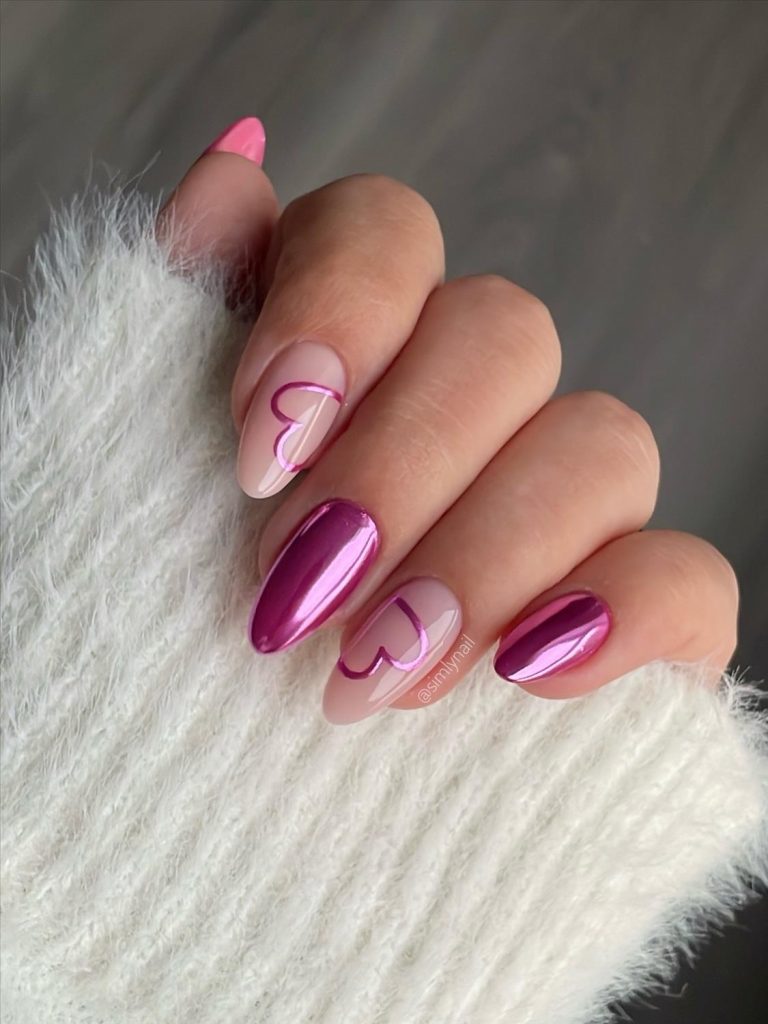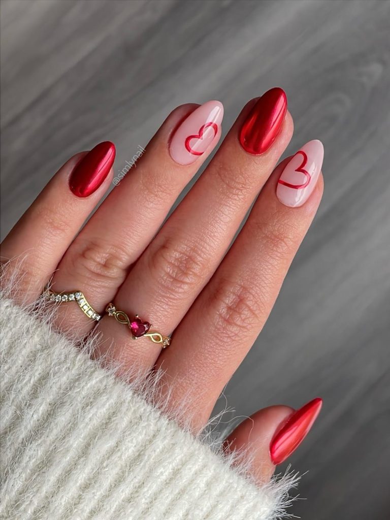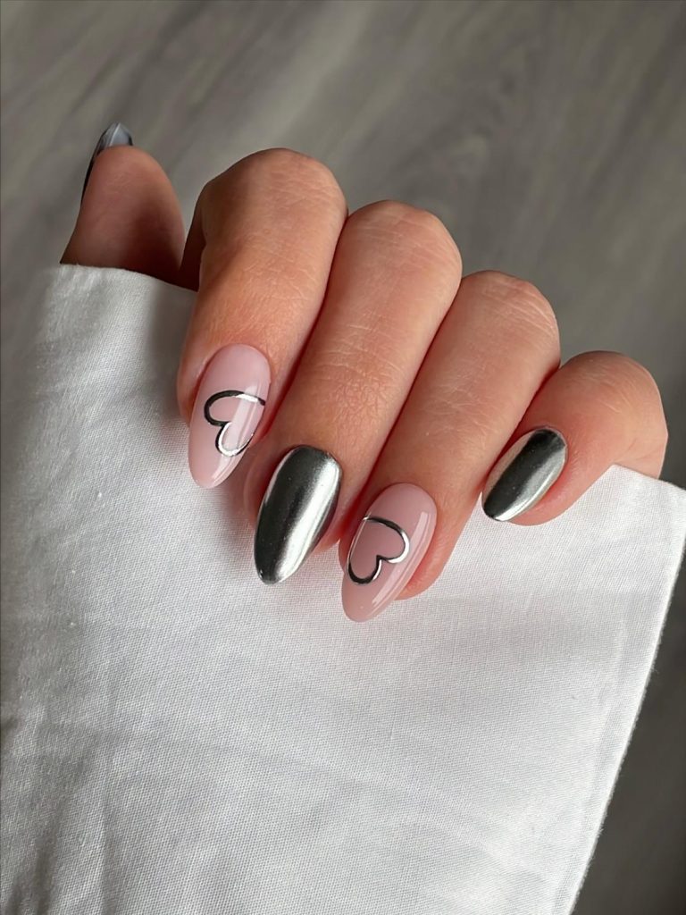 Almond nails are perfect for romantic Valentine designs. Heart French tips, chrome finishes, and soft pink gradients look especially flattering on almond-shaped nails.