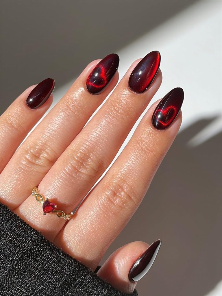 Coffin Valentine nails are bold and dramatic. They’re often paired with rhinestones, chrome hearts, layered reds, and glossy top coats for a statement Valentine’s Day manicure.